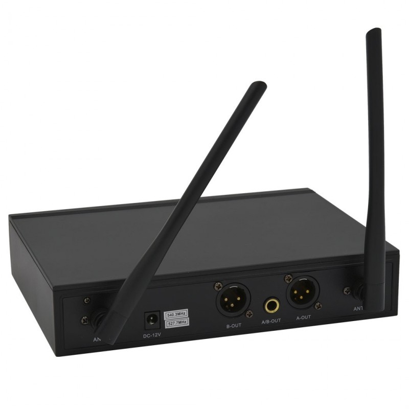 A vevő két nagy érzékenységű antennával van felszerelve. Az előlapon található a tápkapcsoló, a mikrofon hangerő-potenciométerei és a rendszer működési paramétereit mutató, jól olvasható LCD kijelző. A hátlapon található egy tápcsatlakozó, két XLR kimenet az A és B csatornákhoz, valamint egy 6,3 mm-es jack kimenet.
