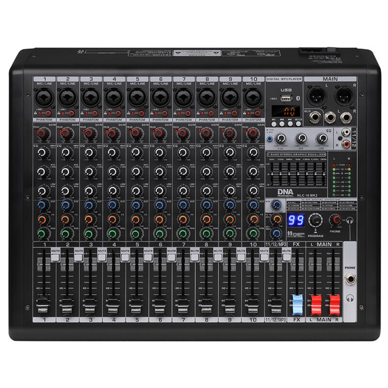Az audiokonzol mind a tíz sávja rendelkezik egy kiegyensúlyozott MIC/LINE bemenettel a nagy impedanciájú jelbemenethez és egy Phantom +48V tápkapcsolóval. Mindegyik bemenet csatlakoztatható mikrofonhoz, de lemezjátszóhoz, DJ konzolhoz vagy például billentyűs hangszerhez is. Az egysávos szinten olyan paramétereket vezérelhetünk, mint a hangerősítés szintje, a magas, közép és mély hangok frekvenciatartománya, szabályozhatjuk az effektusok szintjét, leválaszthatjuk vagy elnémíthatjuk az egysávos sávot, beállíthatjuk az AUX szintjét. jel és pásztázza a hangot a fő busz bal és jobb csatornája között. A kényelmes csúszó fadereknek köszönhetően könnyen beállíthatja a kívánt hangerőt, és az esetleges túlhajtási eseteket egy piros LED jelzi gyorsan. Az audiokeverő fő része lehetővé teszi külső felvevő vagy lejátszó csatlakoztatását a konzolhoz, külső eszközök visszatérő jelének bevitelét, valamint a 99 multieffekt beépített digitális processzorának vezérlését. A 7 sávos grafikus hangszínszabályzó lehetővé teszi a kívánt keverési hang beállítását, amely fejhallgatóval pontosan nyomon követhető. A DNA HLC 6 MK2 további előnye az FX TO AUX szintszabályozás.