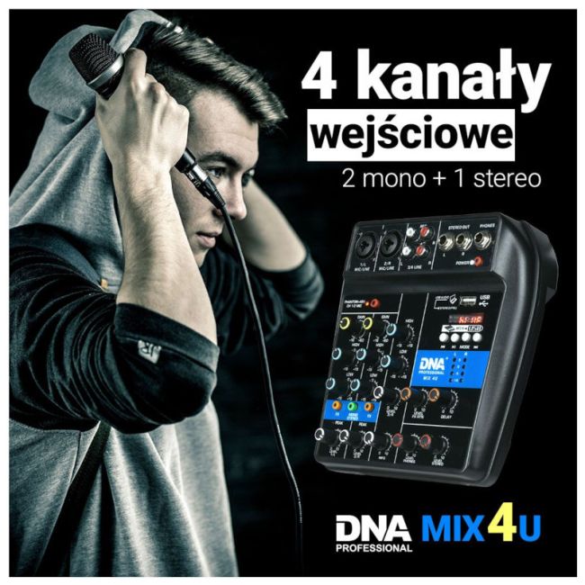 A DNA MIX 4U egy könnyű és nagyon kicsi analóg színpadi keverő, amely támogatja a Bluetooth vezeték nélküli kommunikációs szabványt, USB porttal és MP3 fájltámogatással és Phantom +48V tápegységgel. A készülék 4 csatornát támogat. 2 db kombó XLR/jack jelbemenettel rendelkezik, mely egy speciális kapcsolónak köszönhetően monó módban vagy egy sztereó csatornaként is működhet, a 3. és 4. csatornához pedig sztereó RCA (cinch) csatlakozóval rendelkezik. A felhasználó szabályozhatja a hangerőt az egyes csatornák szintjét, használjon 2 sávos hangszínszabályzót a magas és mély hangokhoz, valamint fokozza a jelet az 1-es és 2-es bemeneteken. Ezen kívül az audiokeverő rendelkezik egy beépített késleltetési effektussal, melynek frekvenciája és szintje egyszerűen szabályozható egy kiválasztott csatornán. A kimeneti jel hangszóróra küldhető, vagy fejhallgatón figyelhető. Ennek a hangkeverőnek a legerősebb tulajdonsága a beépített MP3 lejátszóval ellátott USB port, amellyel laptopot, külső memóriakártyákat vagy egyéb audiojeleket küldő eszközöket csatlakoztathatunk a konzolhoz.