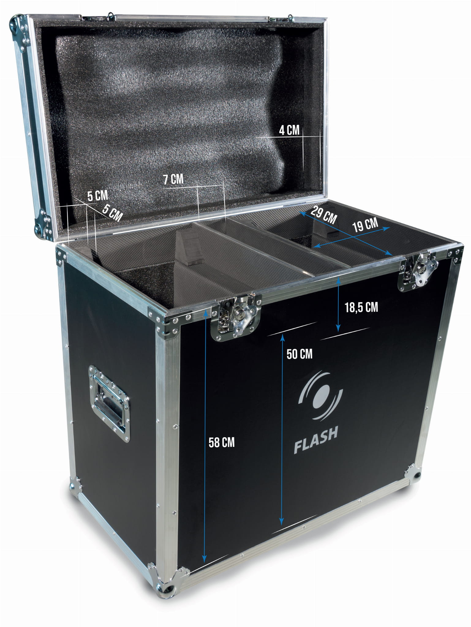 Masszív szállítódoboz 2 eszközhöz, például: 3R Moving Head 3in1. Belső válaszfalainak köszönhetően biztosítja az eszközök biztonságos tárolását és szállítását, a kábelekkel és tartozékokkal együtt. A doboz alumínium profilokkal megerősített, szélein gömbsarkok találhatók, amelyek ráadásul rögzítik a szerkezetet és védik a környezetet az éles szélek kiküszöbölésével. Az egyik oldalon nyílik, a megfelelő dőlésszög pedig megakadályozza a doboz felső részének leesését, így könnyű és kényelmes hozzáférést biztosít a tárolt tárgyakhoz. Közepe rekesszel, puha technikai habbal párnázott, mely tökéletesen védi a tárolt tárgyakat a sérülésektől. A doboz oldalán kényelmes fogantyúk találhatók a szállításhoz.