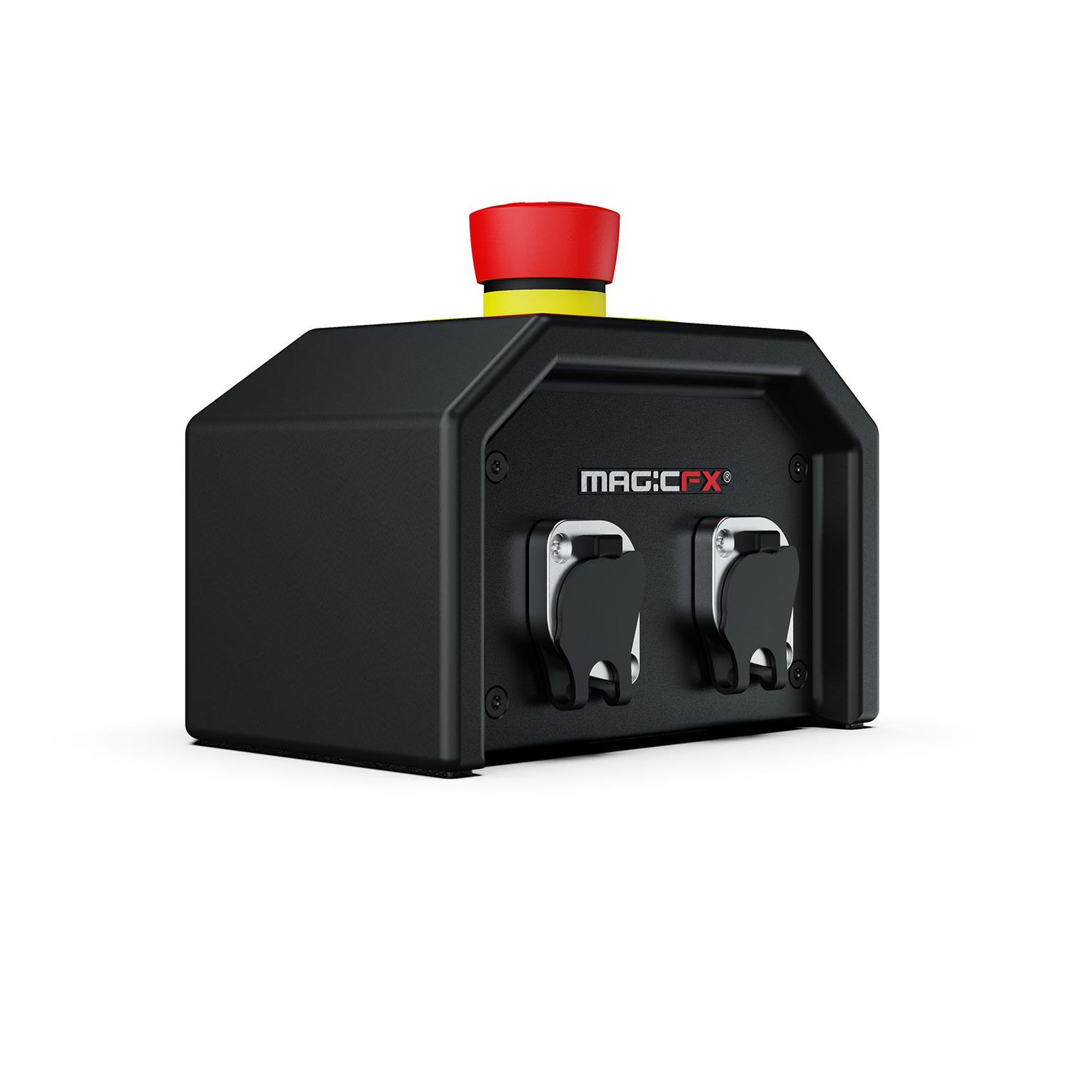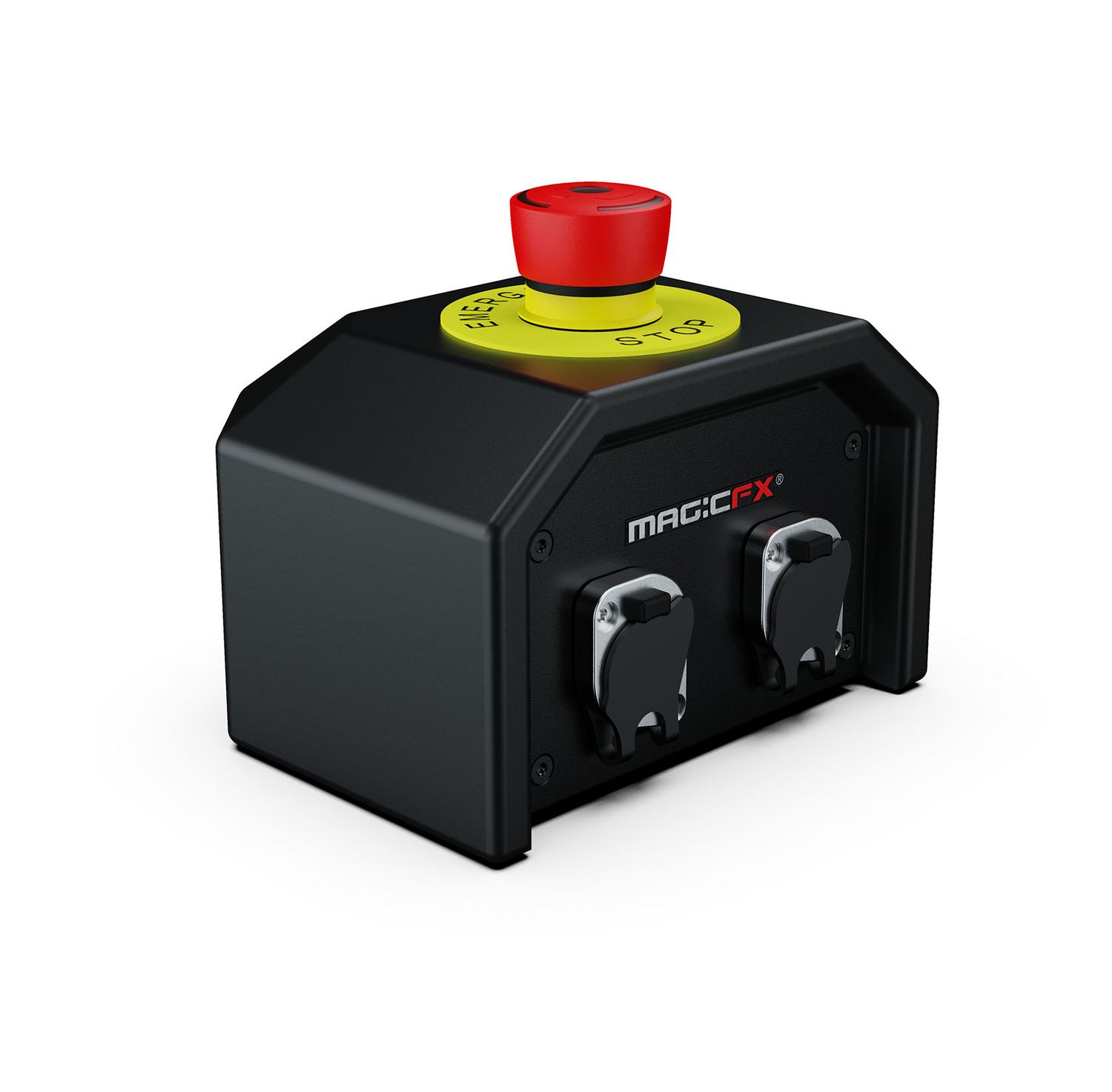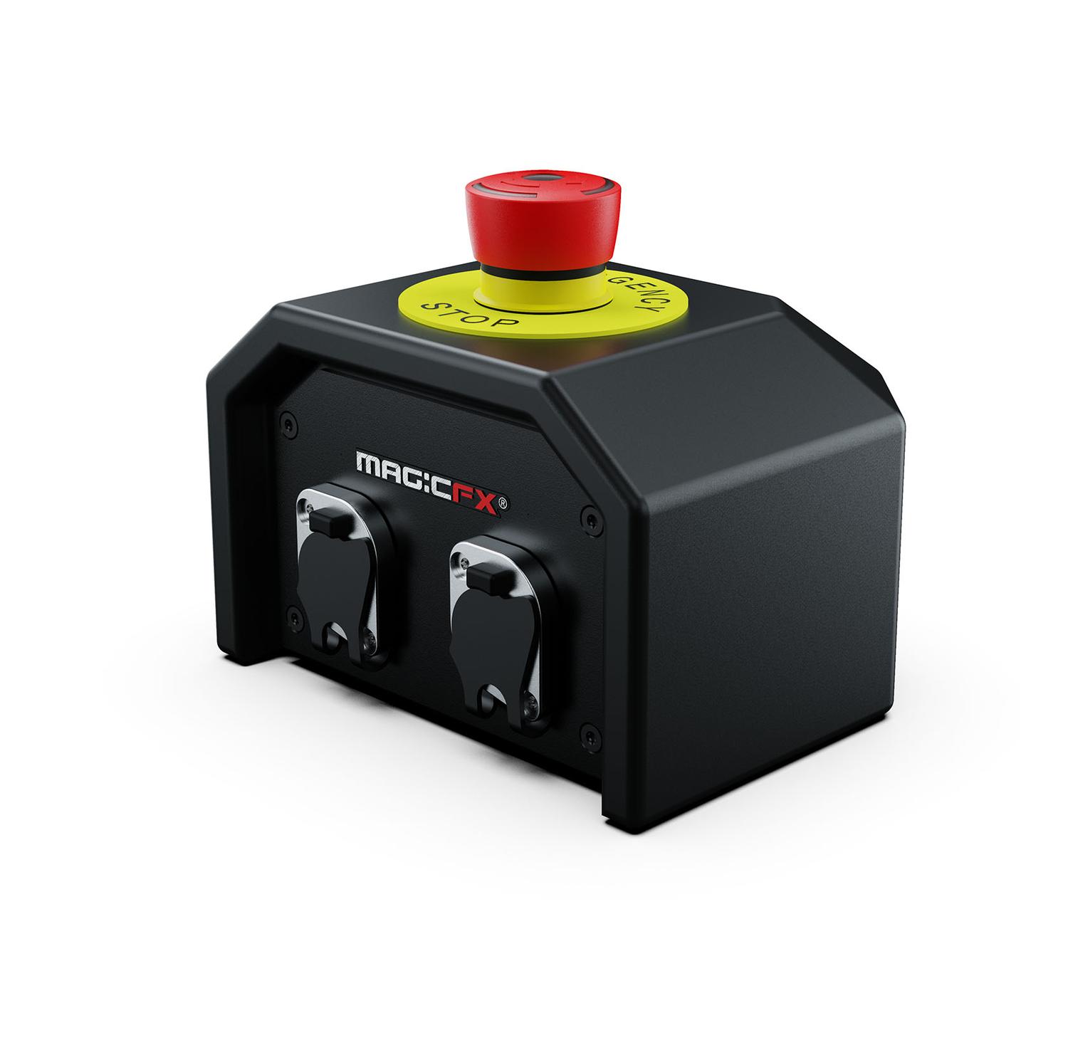 Az sfx biztonsági kar vezérlő egy vagy több soros e-stoppal bővíthető, hogy a színpad mellett elhelyezhető legyen az sfx biztonsági menedzser számára. Az e-stopok világítanak, ha a rendszer élesítve van, hogy egyértelmű jelzést adjon. Amikor az e-stop megüti, a rendszer visszajelzést küld a kezelőnek, így a karvezérlőn látni fogja, hogy nem biztonságos helyzet áll fenn. A kezelő azt is láthatja, ha a helyzet újra tiszta, és alaphelyzetbe állíthatja a rendszert, így folytatódhat a műsor!