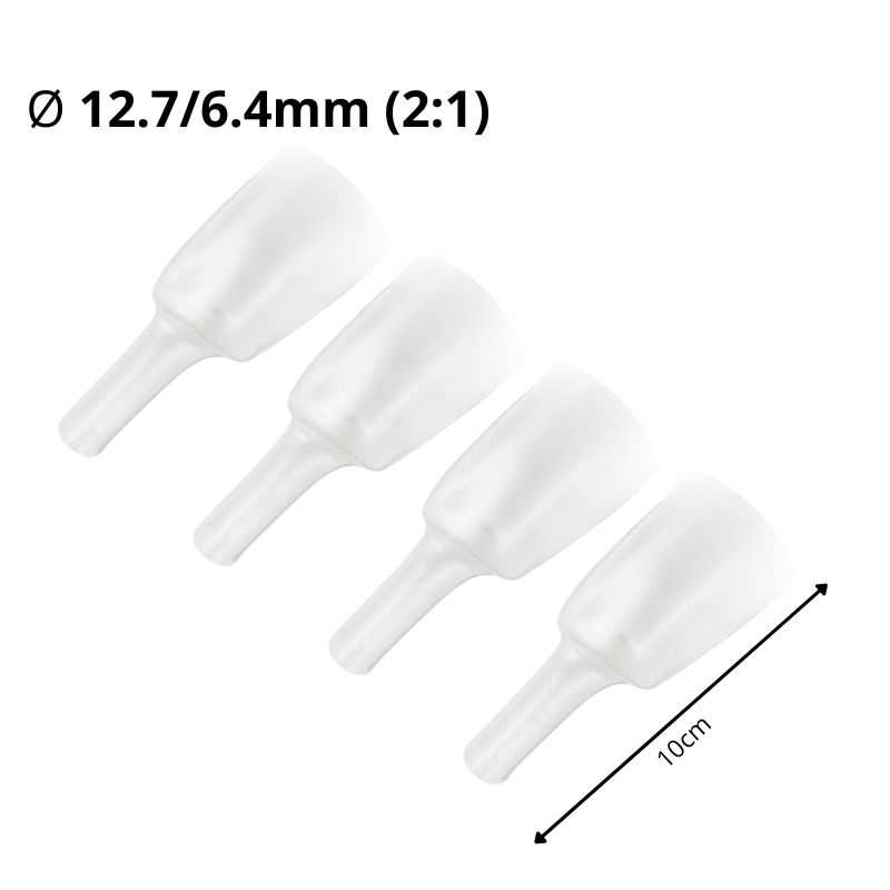 4 darabos kiszerelésű átlátszó zsugorcső szett, egyenként 10 cm hosszú darabokkal. Külső átmérő: 12.7mm, zsugorodás után: 6.4mm (2:1 arány). Tökéletes precíz munkákhoz, kis méretű kábelekhez.
